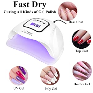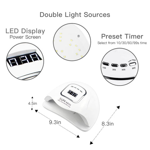Gel nail light with UV+LED light dual light sources to cover an extremely wide ultraviolet band for curing all kinds of UV gel nail polish, glue, basecoat, topcoat, poly gel, and acrylic nails.