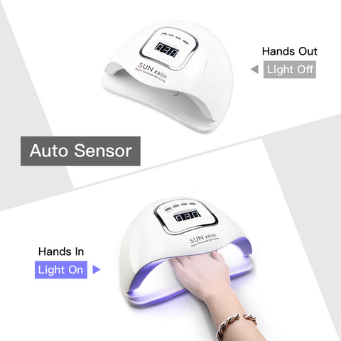 UV nail lamp with auto-sensor for on/off (no switch). Hands in turns light on. Hands out, light off.