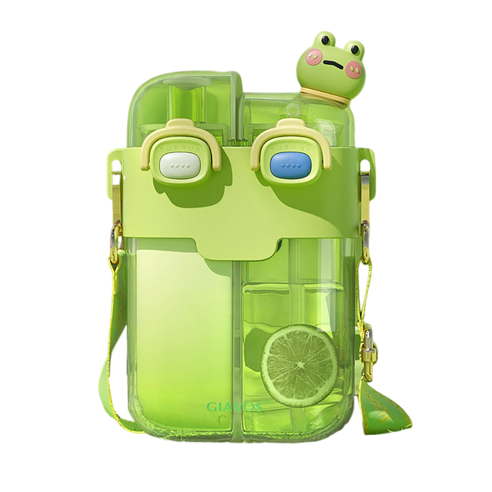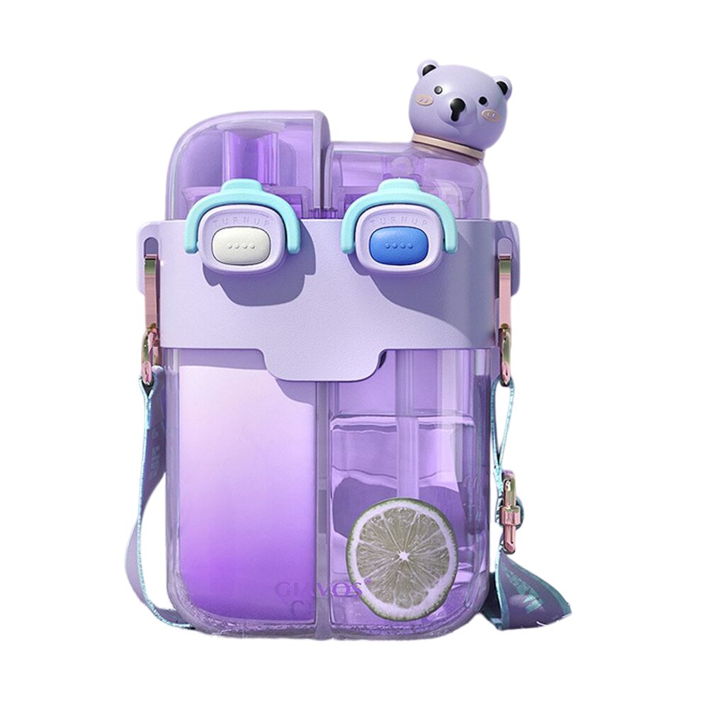 The 780ML Sports Drink Bottle Portable Cartoon Outdoor Sport Water Cup is a convenient and versatile water bottle designed for sports enthusiasts and outdoor activities. It is made of high-quality PC+PP+silicone material and is available in four colors: pink, yellow, green, and purple. The product features two separate spaces, allowing users to carry both water and juice in one bottle. It also has an adjustable strap for easy carrying and a buckle to prevent accidental opening.
