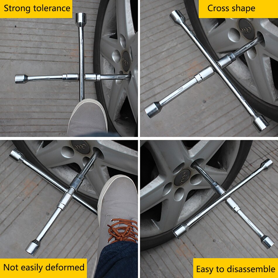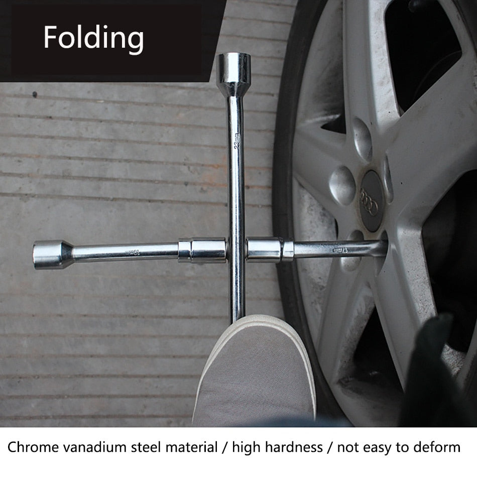 Revolutionize your roadside repairs with the Ultimate Car Repair Cross Wrench Spanner Set. Crafted from high-performance chromium-vanadium steel and polished to a chrome finish, this tool ensures durability and a sleek appearance. Engineered with a folding handle for compact storage and easy portability, it's designed to handle the toughest tasks with ease. Featuring hex socket sizes of 17mm, 19mm, 21mm, and 23mm, it covers all your wheel nut needs. Whether you're a DIY enthusiast or a professional mechanic, trust the ZHCY brand for reliability and precision.