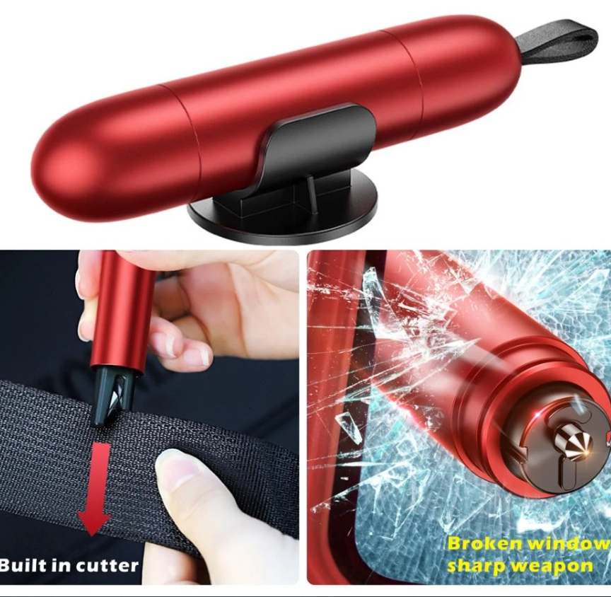 >>Window-breaking hammer: Pull off the lid and easily break the glass by smashing at the four window corners.