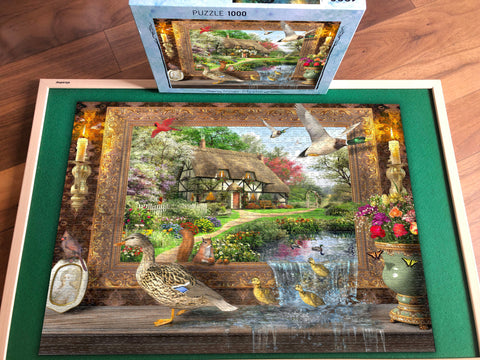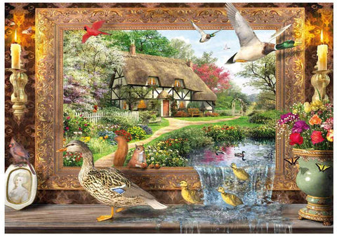 The little pond cascades over the ornate picture frame, and the baby chicks follow their mommy duck to discover a new home. The ducks are having the time of their lives flying up high and out into the big wide world..the thatched cottage is charming and the flowers and butterflies are vibrant and bright.