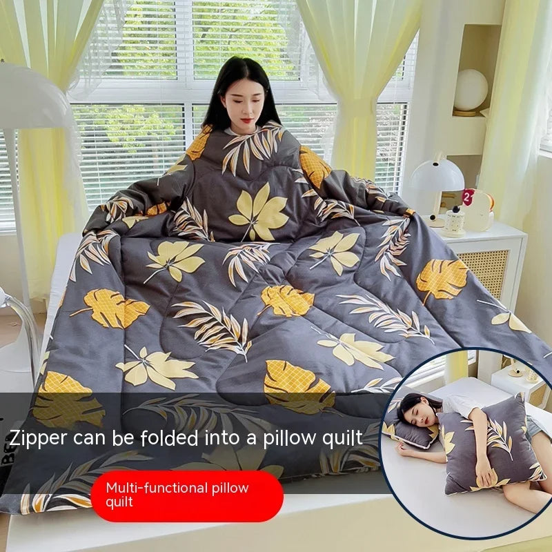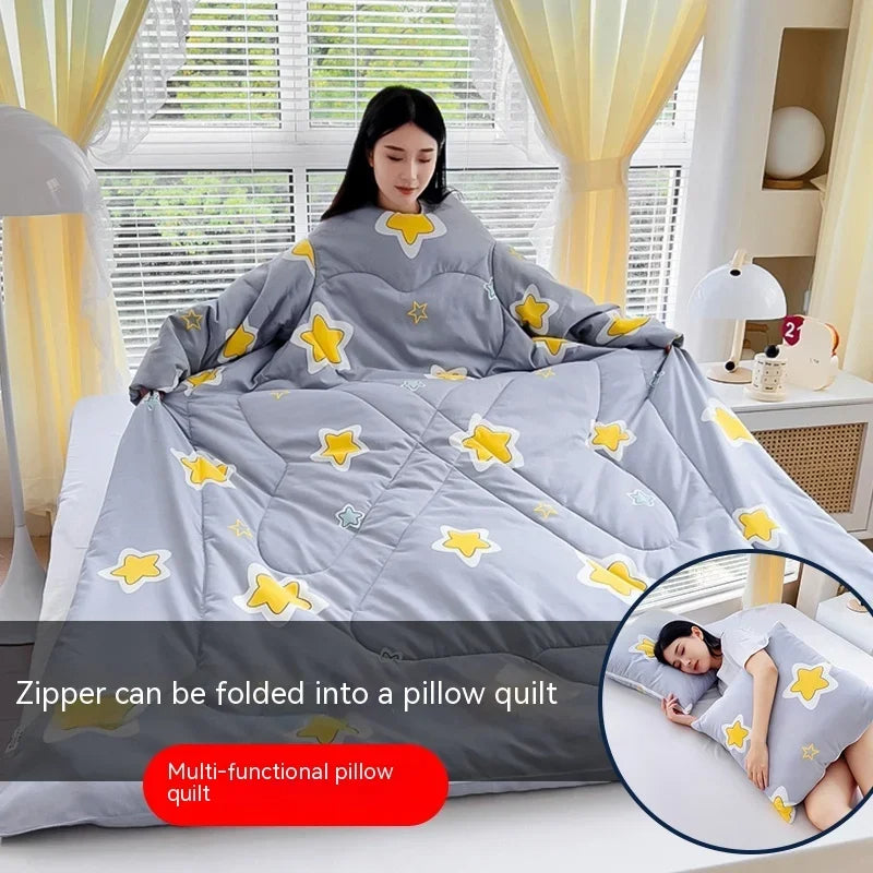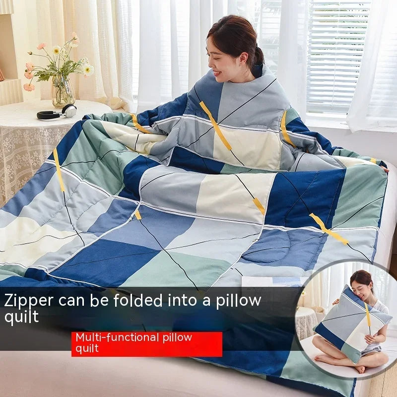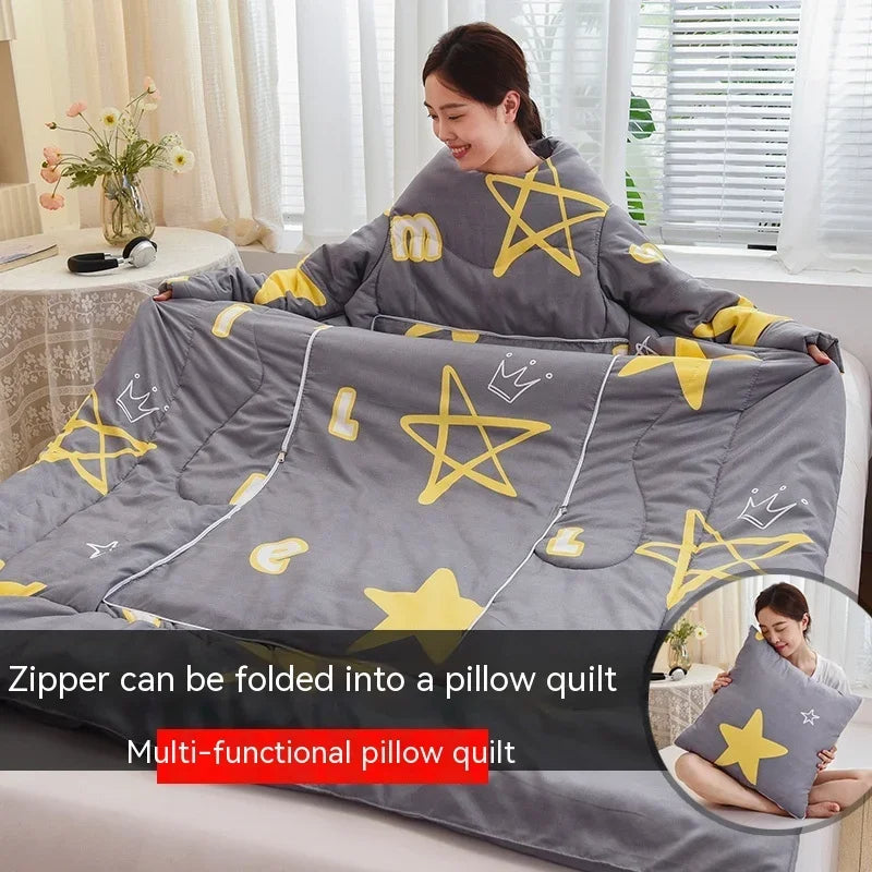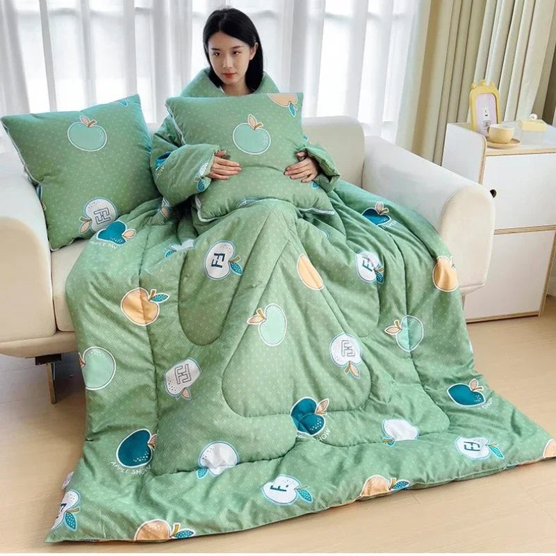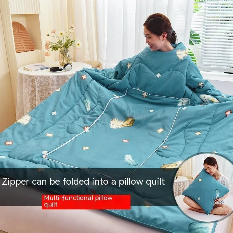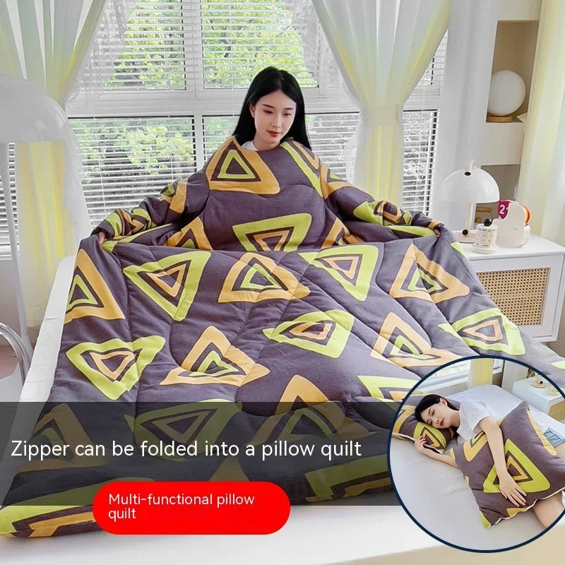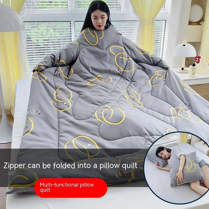Introducing our innovative CozyComfort Sleeved Quilt Pillow, designed to bring you ultimate warmth and convenience during chilly winter nights. With a generous weight exceeding 2200g, this 150X200CM quilt ensures luxurious comfort and insulation against the cold. What sets this quilt apart is its unique feature - it comes with sleeves! Now, you can wrap yourself in warmth without sacrificing mobility. Whether you're lounging on the couch, reading a book, or simply relaxing, our Sleeved Quilt Pillow keeps you cozy and hands-free. Perfect for both adults and children, this quilt also includes shoulder pads to offer added warmth and protection. Plus, the 150X200cm model can be conveniently folded into an adult pillow (50x50cm when unfolded), providing versatility and convenience. Embrace the winter season with our CozyComfort Sleeved Quilt Pillow and say goodbye to cold, restless nights!