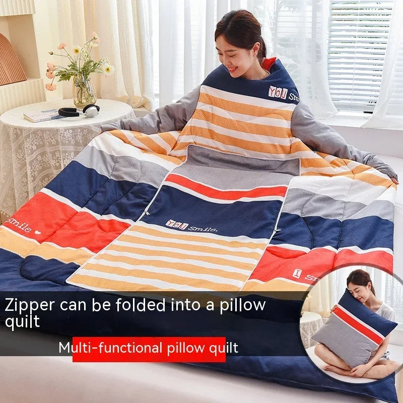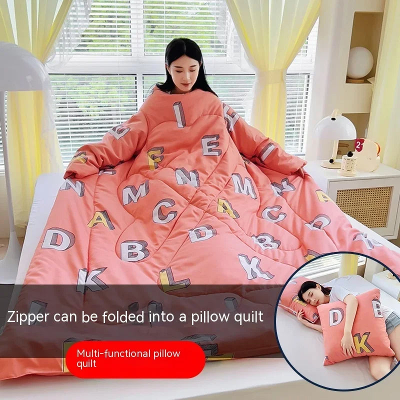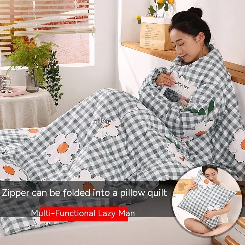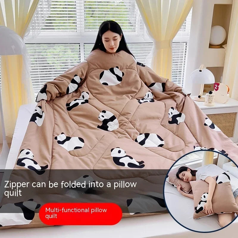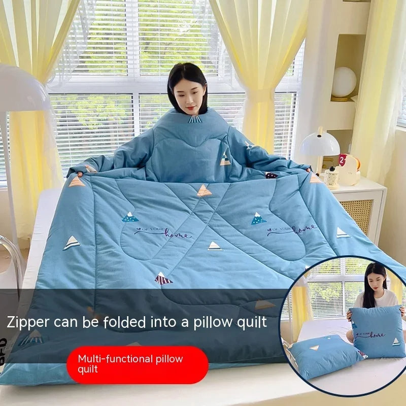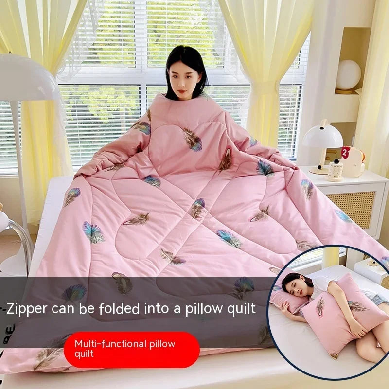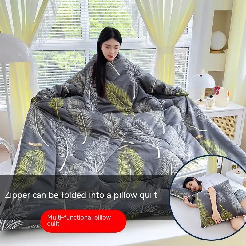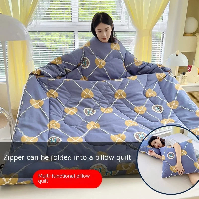 Introducing our innovative CozyComfort Sleeved Quilt Pillow, designed to bring you ultimate warmth and convenience during chilly winter nights. With a generous weight exceeding 2200g, this 150X200CM quilt ensures luxurious comfort and insulation against the cold. What sets this quilt apart is its unique feature - it comes with sleeves! Now, you can wrap yourself in warmth without sacrificing mobility. Whether you're lounging on the couch, reading a book, or simply relaxing, our Sleeved Quilt Pillow keeps you cozy and hands-free. Perfect for both adults and children, this quilt also includes shoulder pads to offer added warmth and protection. Plus, the 150X200cm model can be conveniently folded into an adult pillow (50x50cm when unfolded), providing versatility and convenience. Embrace the winter season with our CozyComfort Sleeved Quilt Pillow and say goodbye to cold, restless nights!