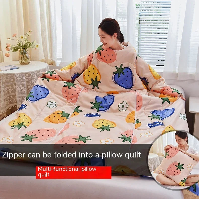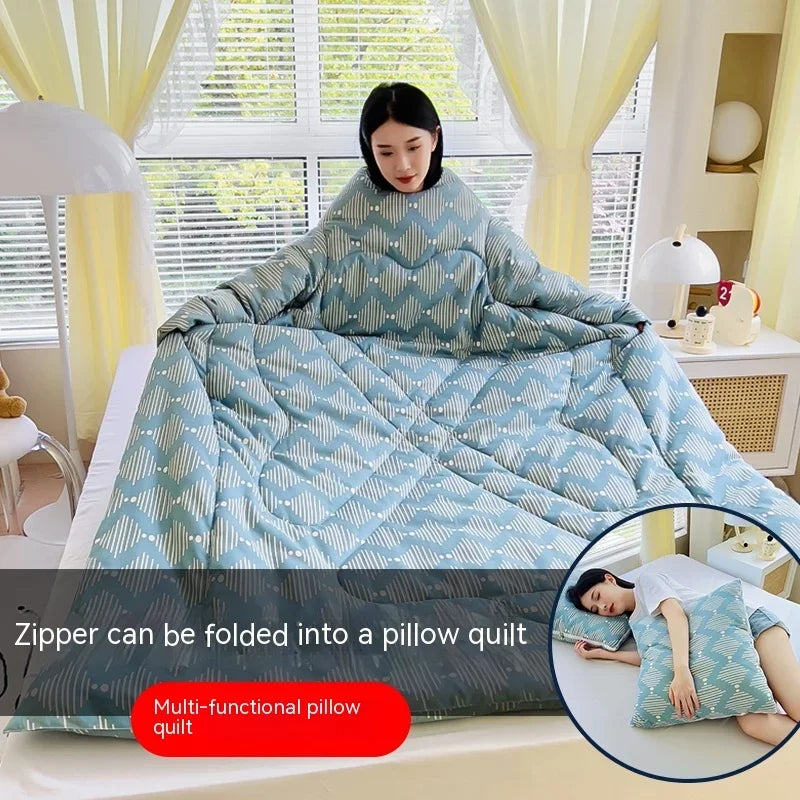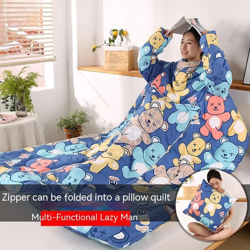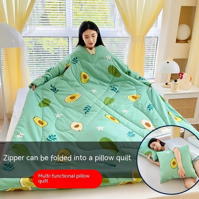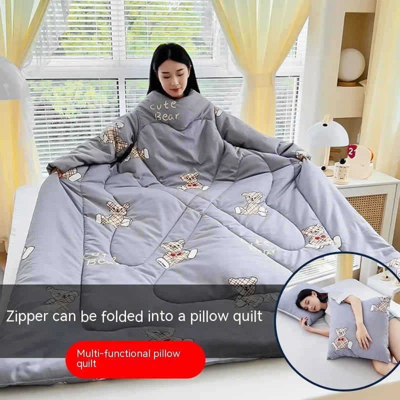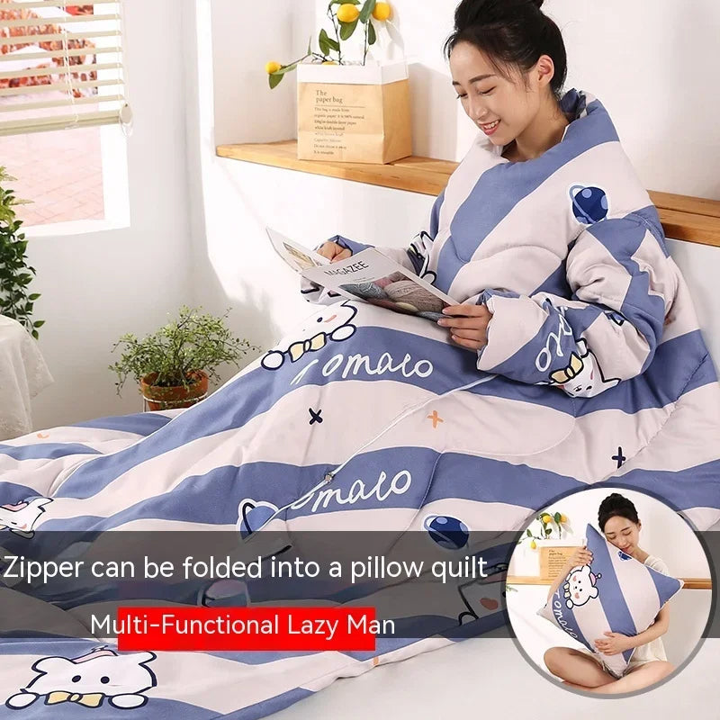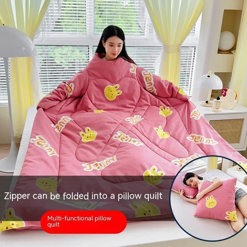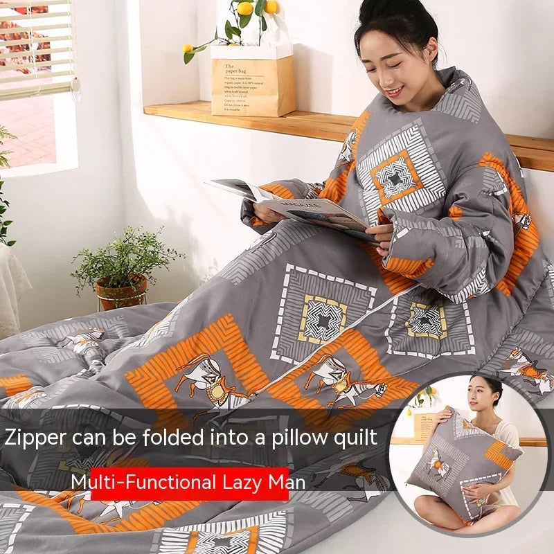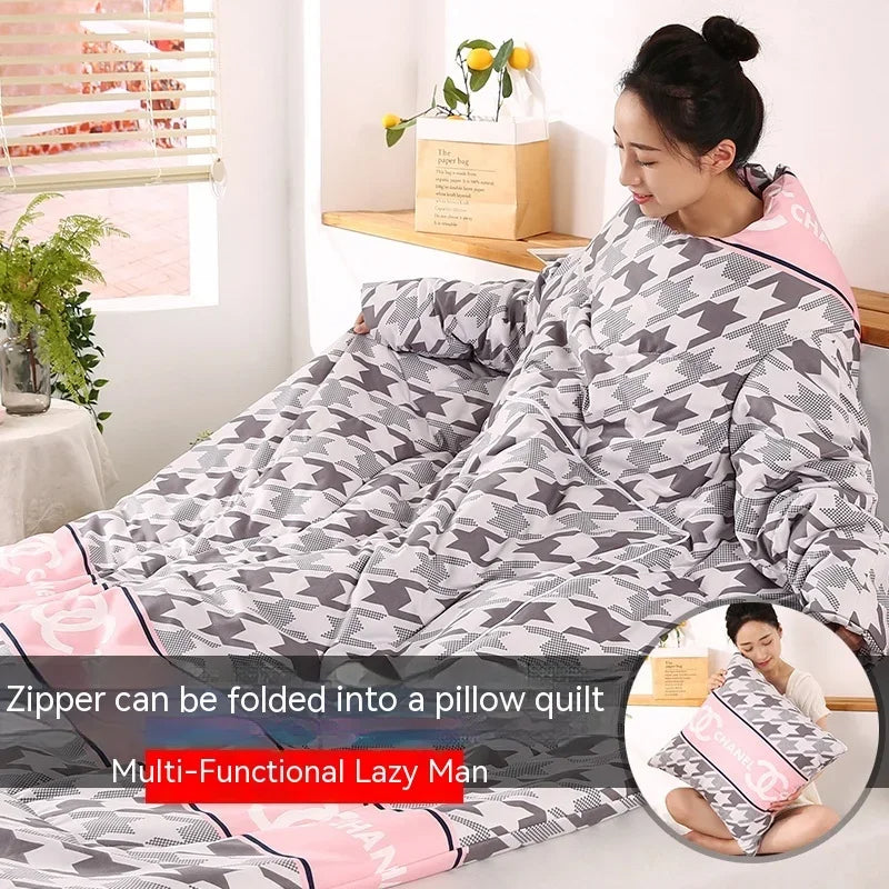 Introducing our innovative CozyComfort Sleeved Quilt Pillow, designed to bring you ultimate warmth and convenience during chilly winter nights. With a generous weight exceeding 2200g, this 150X200CM quilt ensures luxurious comfort and insulation against the cold. What sets this quilt apart is its unique feature - it comes with sleeves! Now, you can wrap yourself in warmth without sacrificing mobility. Whether you're lounging on the couch, reading a book, or simply relaxing, our Sleeved Quilt Pillow keeps you cozy and hands-free. Perfect for both adults and children, this quilt also includes shoulder pads to offer added warmth and protection. Plus, the 150X200cm model can be conveniently folded into an adult pillow (50x50cm when unfolded), providing versatility and convenience. Embrace the winter season with our CozyComfort Sleeved Quilt Pillow and say goodbye to cold, restless nights!