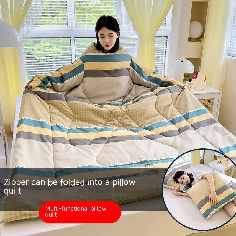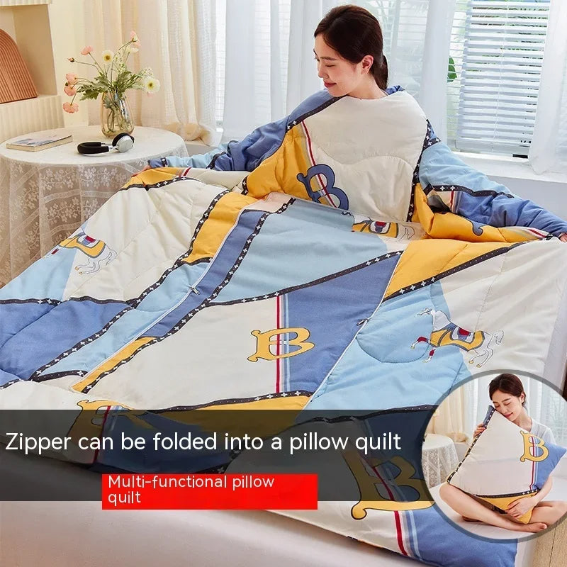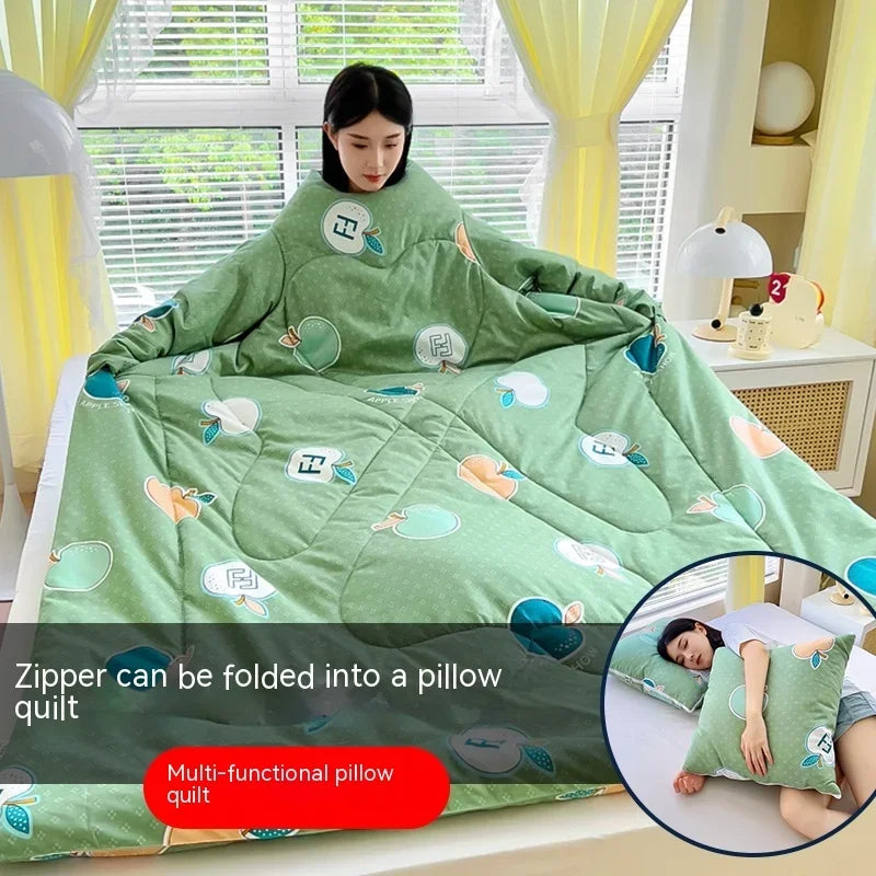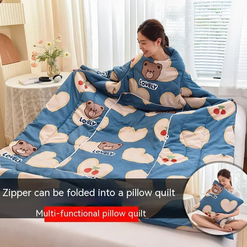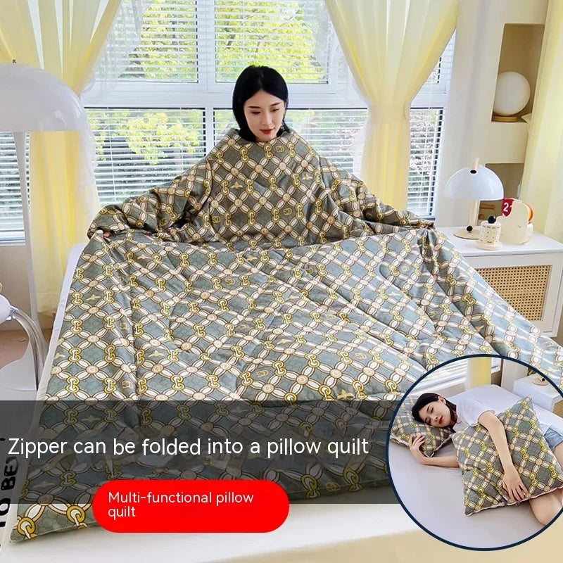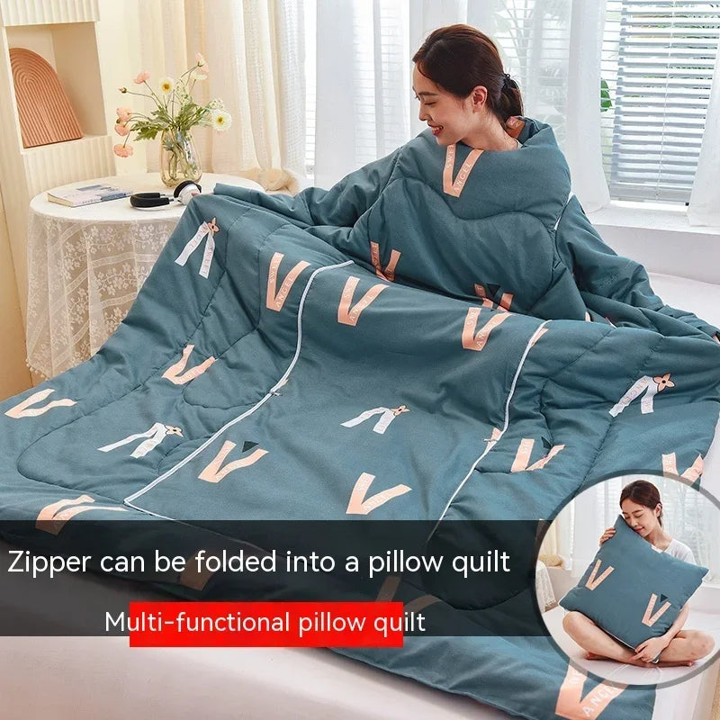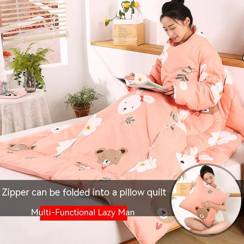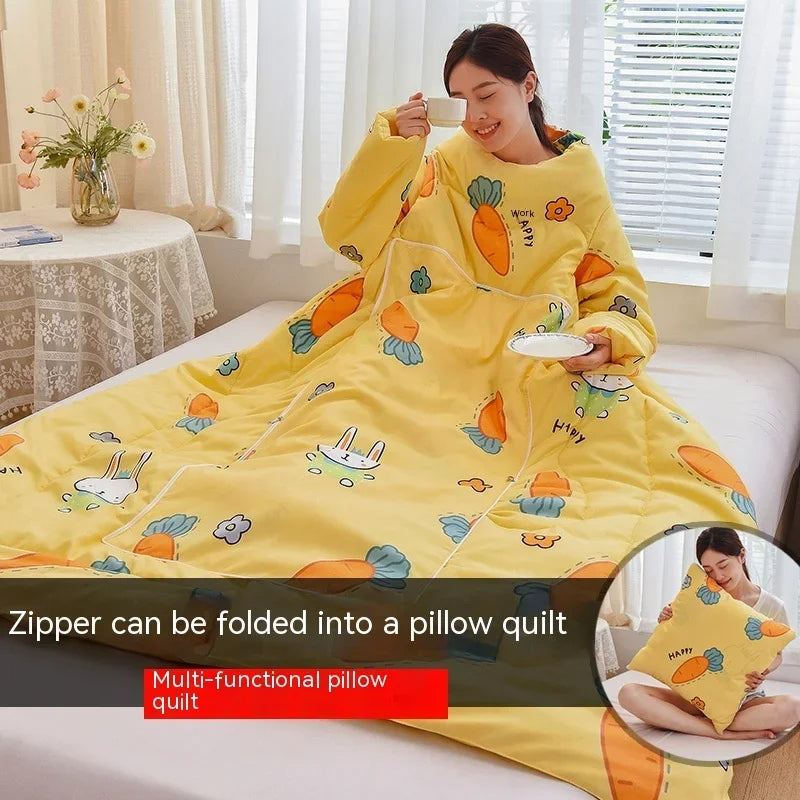 Introducing our innovative CozyComfort Sleeved Quilt Pillow, designed to bring you ultimate warmth and convenience during chilly winter nights. With a generous weight exceeding 2200g, this 150X200CM quilt ensures luxurious comfort and insulation against the cold. What sets this quilt apart is its unique feature - it comes with sleeves! Now, you can wrap yourself in warmth without sacrificing mobility. Whether you're lounging on the couch, reading a book, or simply relaxing, our Sleeved Quilt Pillow keeps you cozy and hands-free. Perfect for both adults and children, this quilt also includes shoulder pads to offer added warmth and protection. Plus, the 150X200cm model can be conveniently folded into an adult pillow (50x50cm when unfolded), providing versatility and convenience. Embrace the winter season with our CozyComfort Sleeved Quilt Pillow and say goodbye to cold, restless nights!