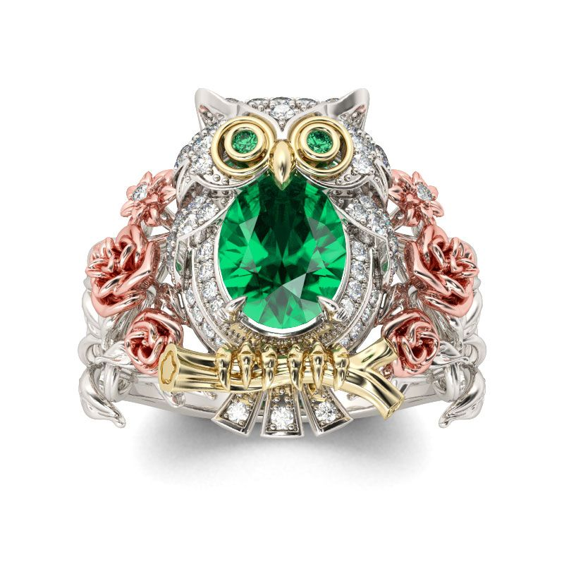 The owl was a bird of prophecy and wisdom in many ancient cultures. This owl ring features a lively two tone owl standing on a gold tone branch. A oval-cut stone is set as the belly of the owl and the claws and eyes are in yellow gold tone. Small stones are set on wings and tail to make the ring sparkle. The shank is sculptured in a roses to perfect the design. Every detail of the design is carefully handcrafted by our excellent artisans. If you are looking for special and stylish jewelry, then just take this piece.