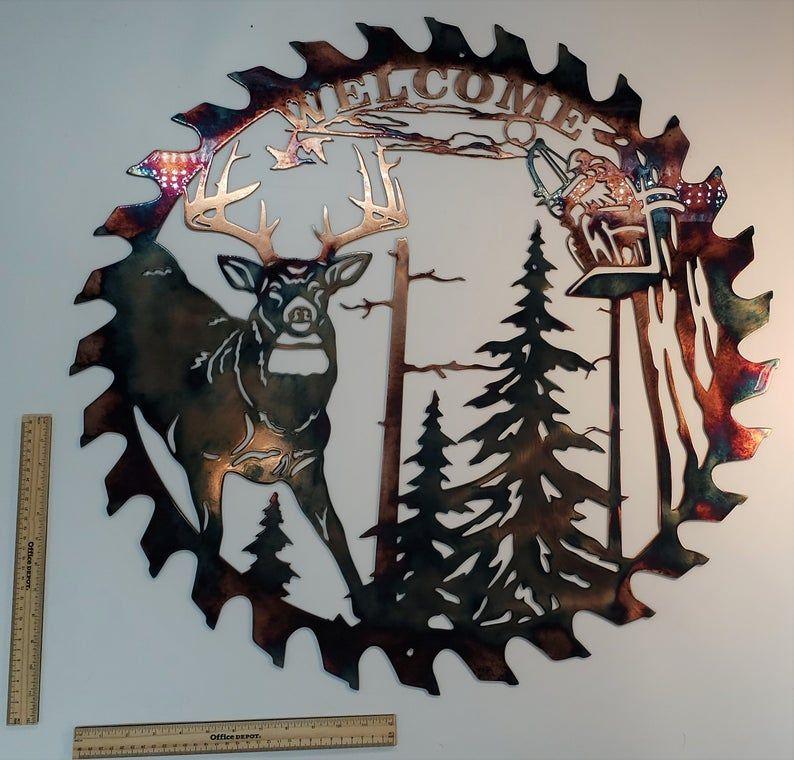 2、This welcome sign is a 30" saw blade shaped design depicting a bow hunter at full draw over a giant whitetail buck. Patina and dyed finish with high gloss clear.