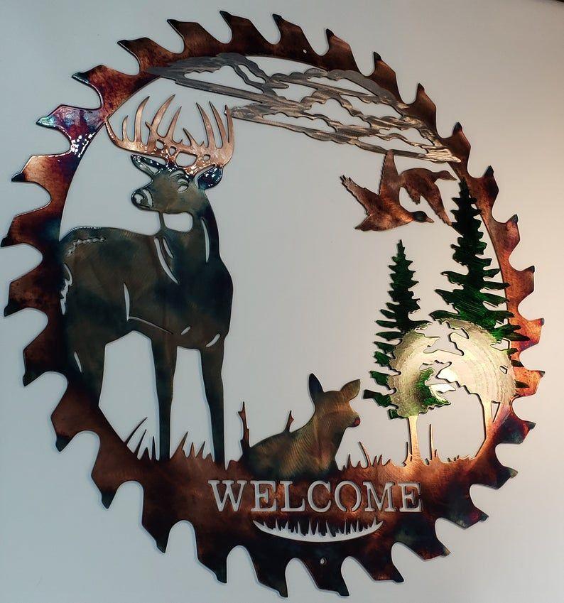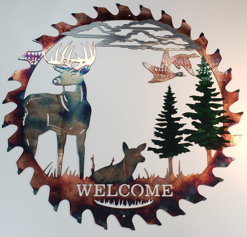 3、This welcome sign is a 30" saw blade shaped design depicting a morning wildlife scene with deer and ducks. Patina and dyed finish with high gloss clear. Countersink holes provided for easy installation.