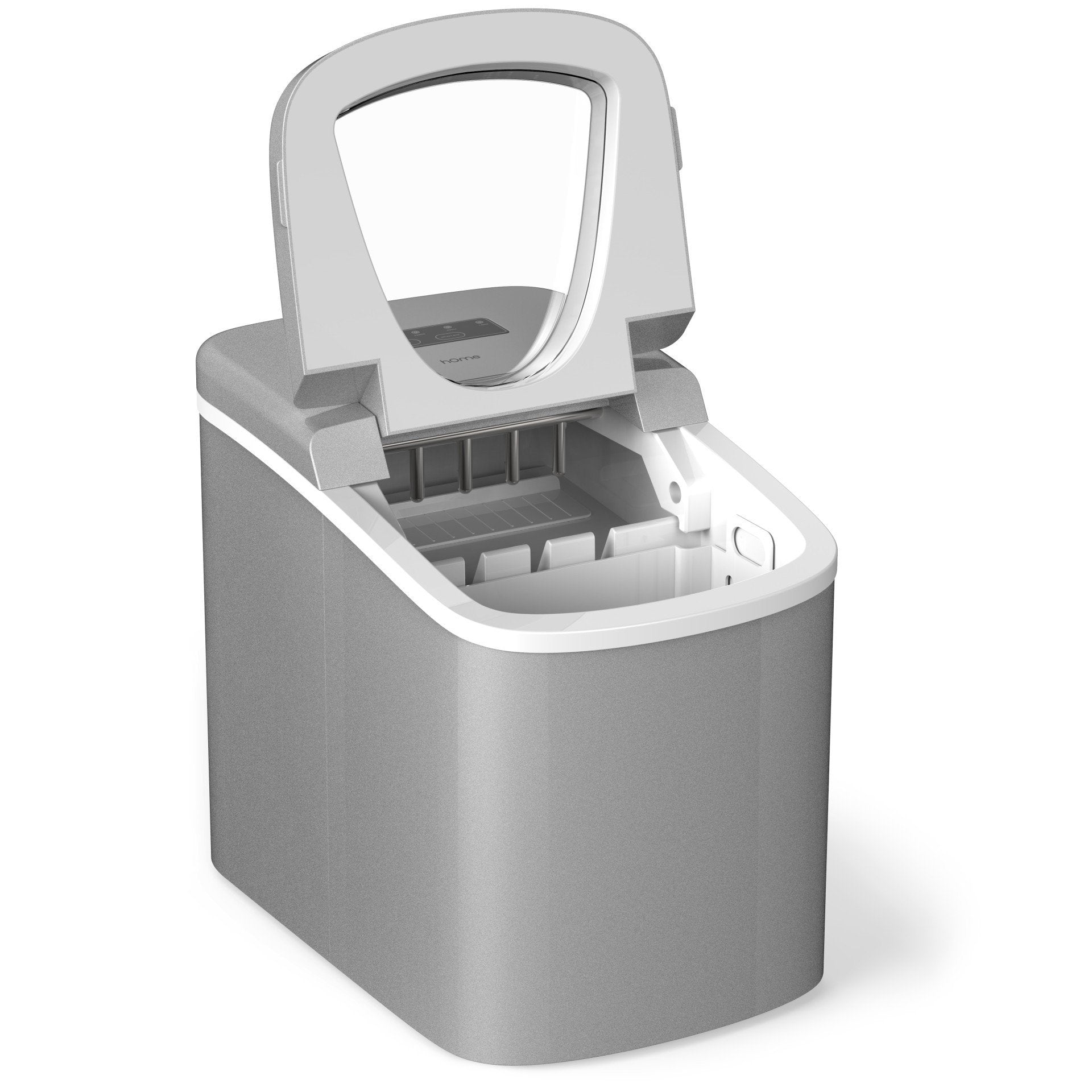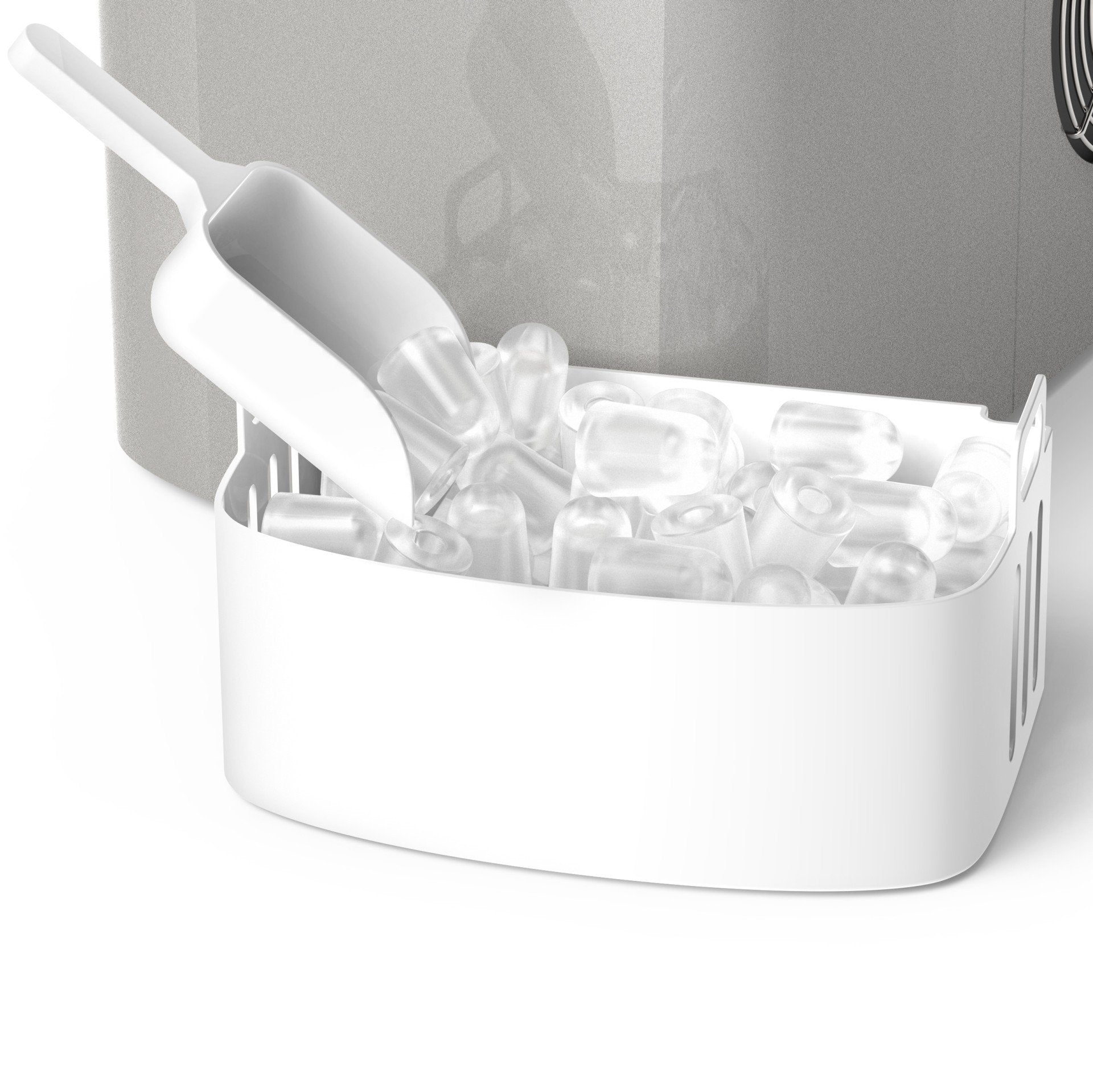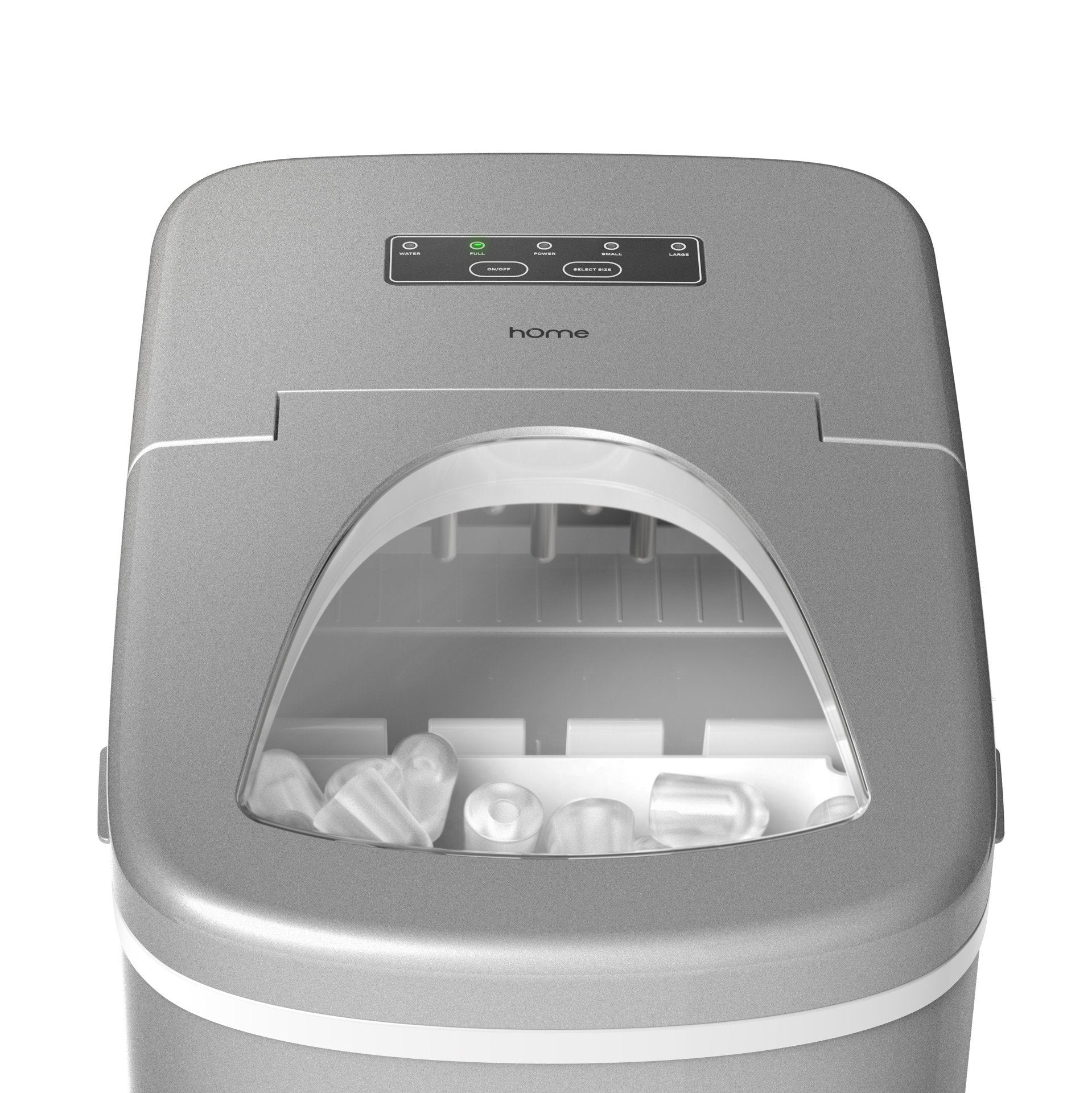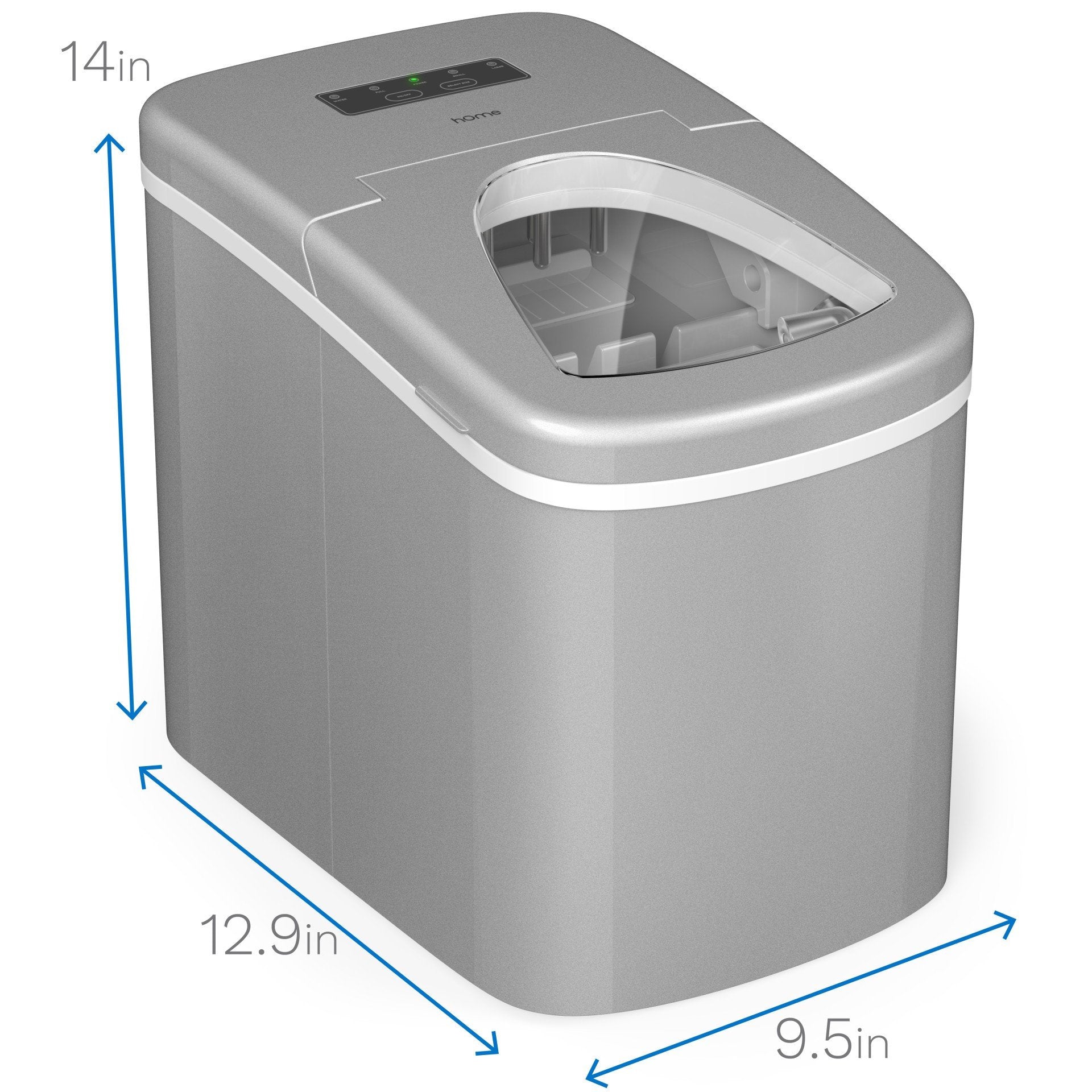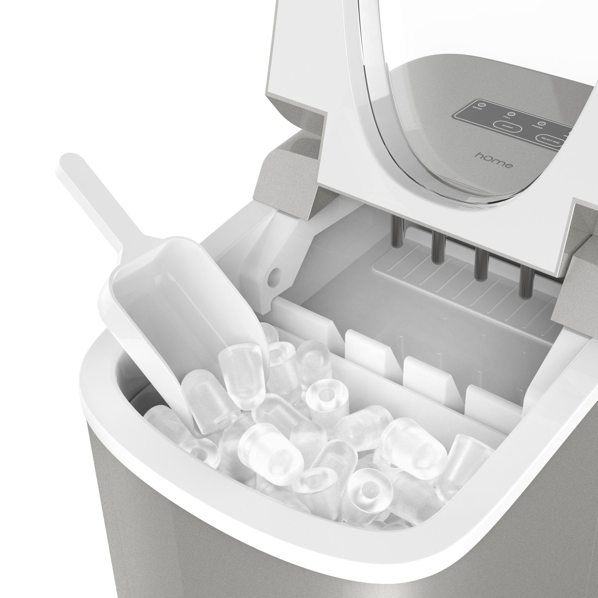 - Super Fast Ice Production: Makes small or medium-sized ice cubes in just 6 to 8 minutes. Warning lights activate when the ice basket is full or when water needs to be refilled. Includes a handy scoop for serving. Smart design features auto shut-off, and a reservoir that reuses water from melted ice to make even more ice!