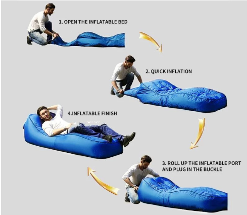 With the Inflatable Lazy Beach Sofa Bed, you can enjoy the great outdoors anytime, anywhere; This inflatable couch is a folding chair, hammock, picnic blanket and a pool floatschair all in one, while saving you the hassle. It won't leave you blue in the face from trying to blow it up. Simply unfold, scoop air into it and roll and buckle.
