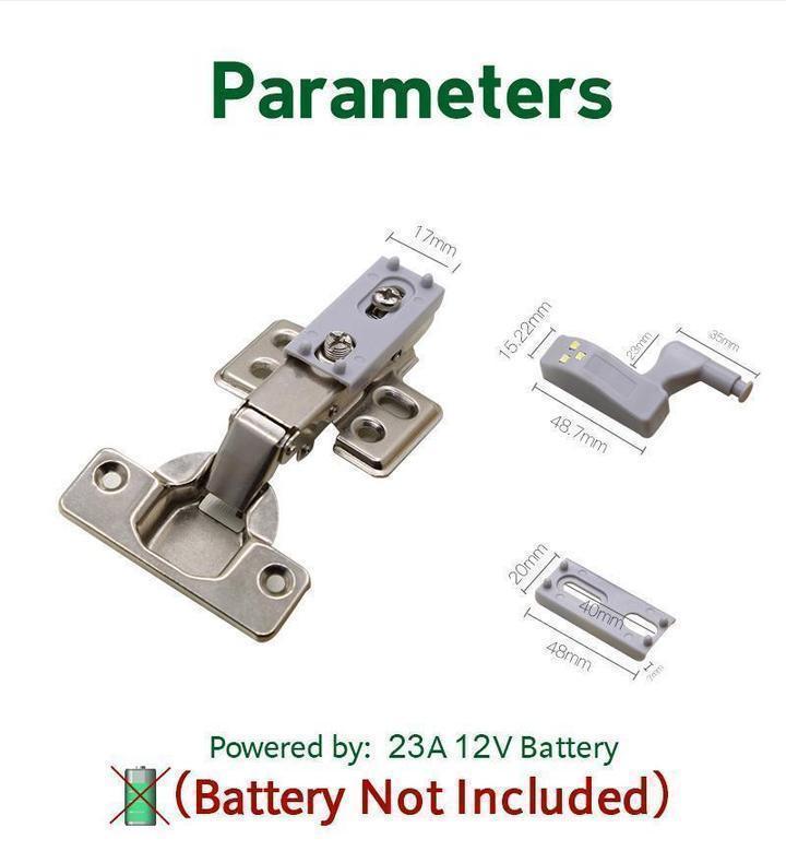 - Our hinge light has 3pcs LED beads and it is operated by 12A 23V battery, having properties of high brightness and lower power consumption, it is really a practical and affordable cabinet light