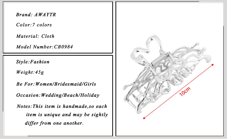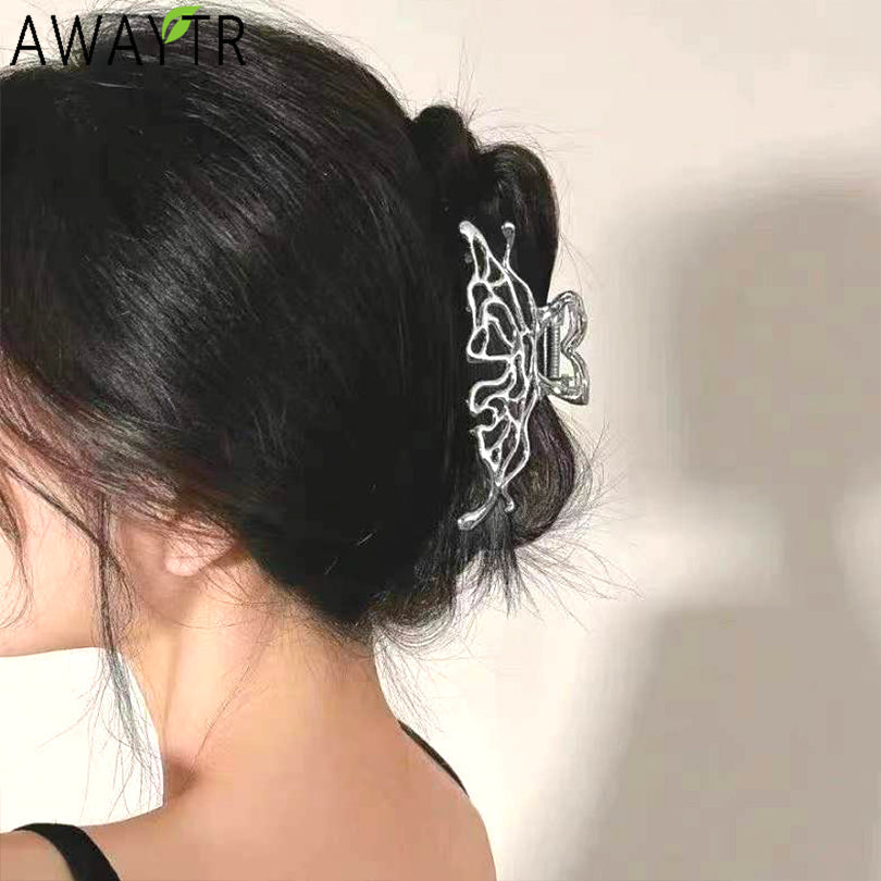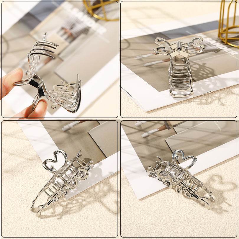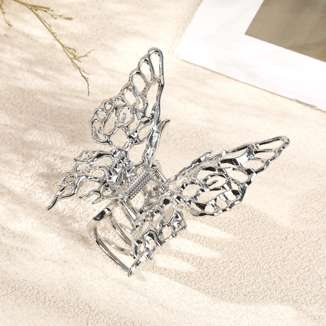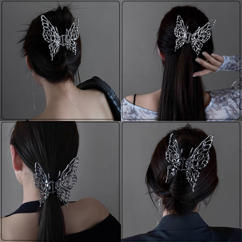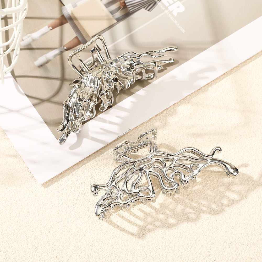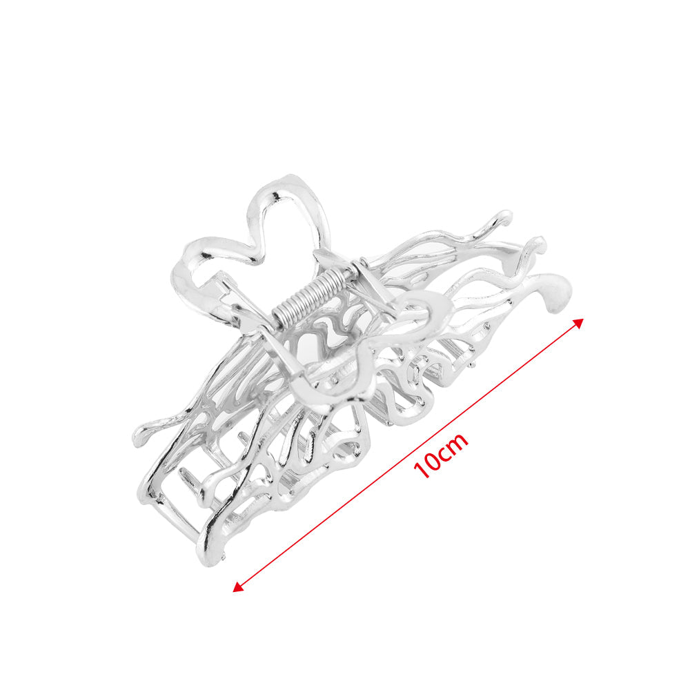 Elevate your hairstyle with our Elegant Retro Metal Silver Butterfly Hair Claw, a stunning accessory designed for fashion-forward women. Crafted from high-quality plastic and satin, this chic hair clip features a unique hollow abstract butterfly design, making it a perfect statement piece for any outfit.