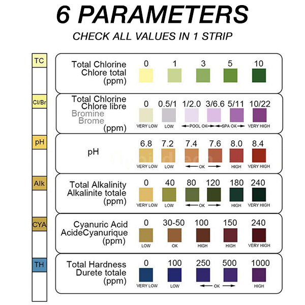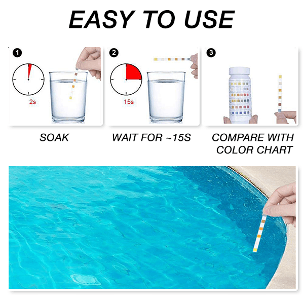 With an easy-to-read color chart, you can identify up to 6 parameters (Total Chlorine, Free Chlorine, Bromine, pH, Total Alkalinity, Cyanuric Acid, Total Hardness) of test solutions within 1 minute. Let's take pH as a reference to keep the water fresh and sparkling clean!