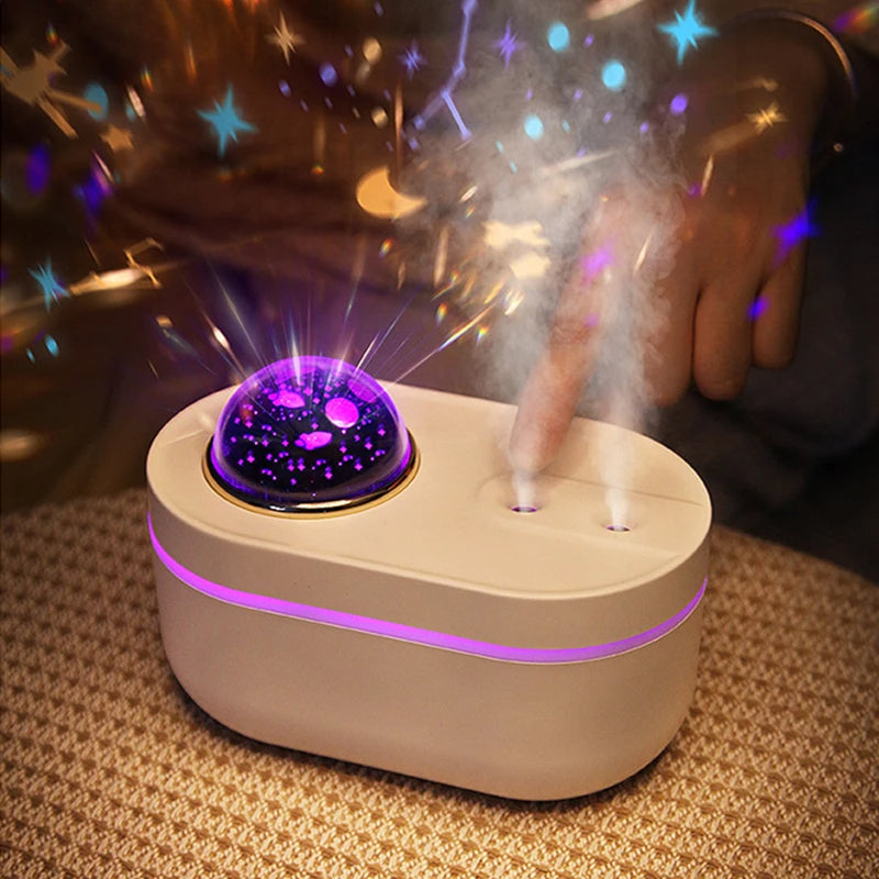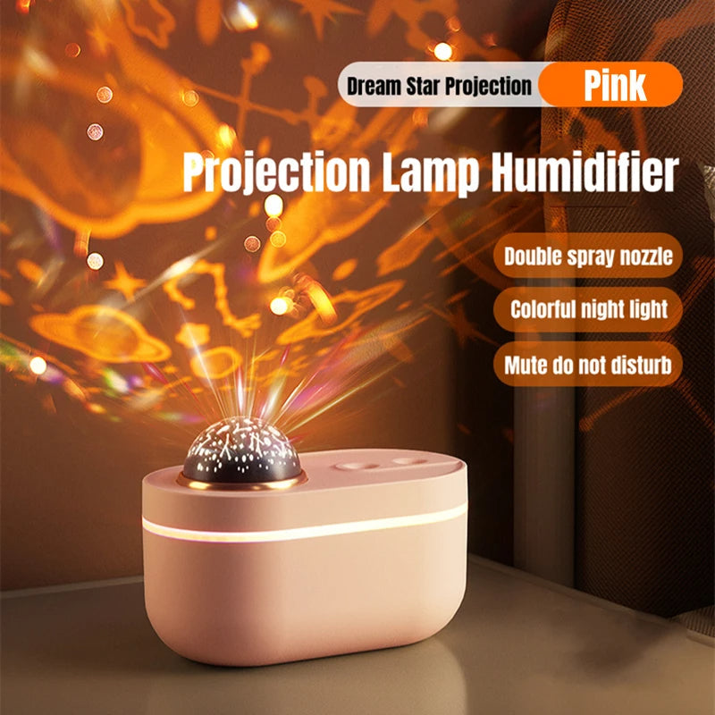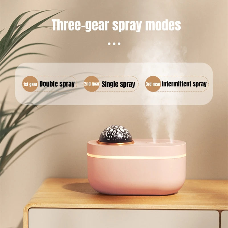 Indulge in the tranquil ambiance of our Dreamscape Projection Humidifier. Featuring dual spray nozzles for enhanced mist dispersion, its generous 520ML water capacity ensures prolonged operation for uninterrupted relaxation. Revel in the mesmerizing starlit projection, casting a dreamy glow without glare, perfect for fostering romantic atmospheres. With whisper-quiet operation, it won't disrupt your slumber or productivity, offering undisturbed serenity. Customize your experience with three adjustable spray modes, maintaining optimal humidity for your ultimate comfort.