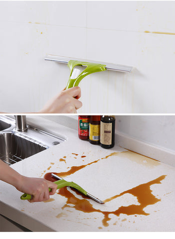 Stainless steel with soft silicone scraper, it will effectively wipes water drops off any flat smooth surfaces quickly and easily.